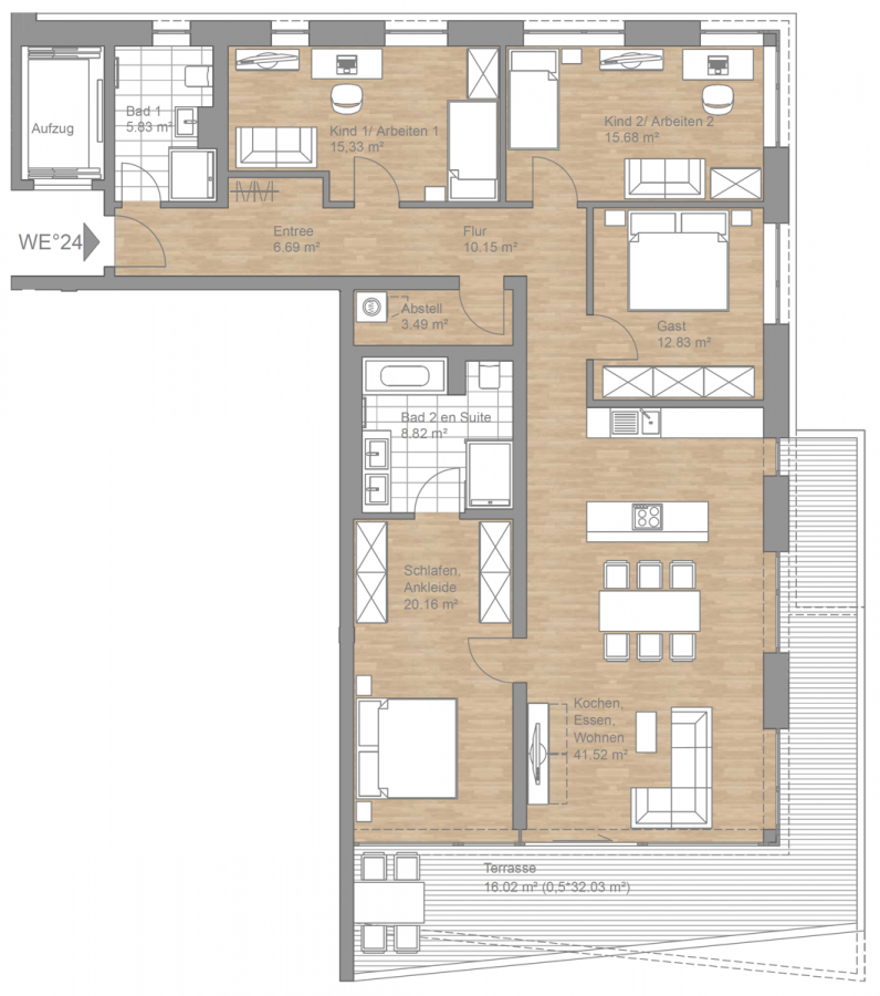 - Eiche-Landhausdielenparkett in allen Wohn- und Schlafräumen
