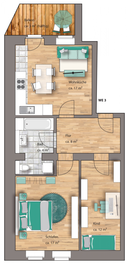 I kompakte 3-RW in Gohlis I Parkett I Fußbodenheizung I Balkon I