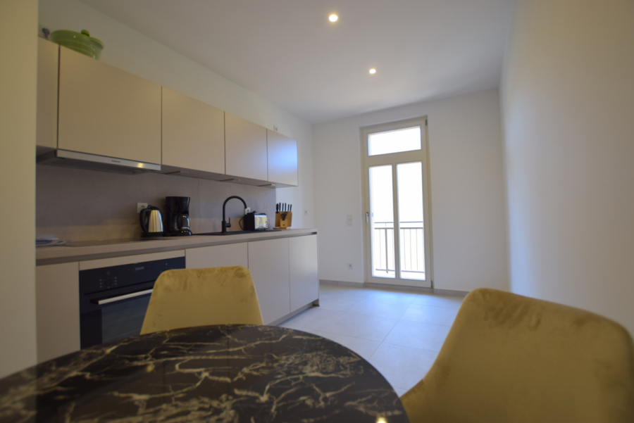 Die moderne Einbauküche ist im Mietpreis enthalten und mit hochwertigen Elektrogeräten ausgestattet. Von hier aus haben Sie direkten Zugang zum Balkon, der sich ideal zum Entspannen, Kaffeetrinken oder für gemütliche Abende im Freien eignet.