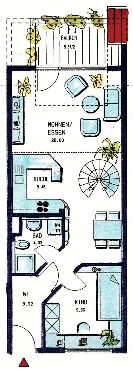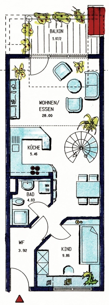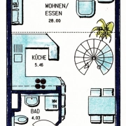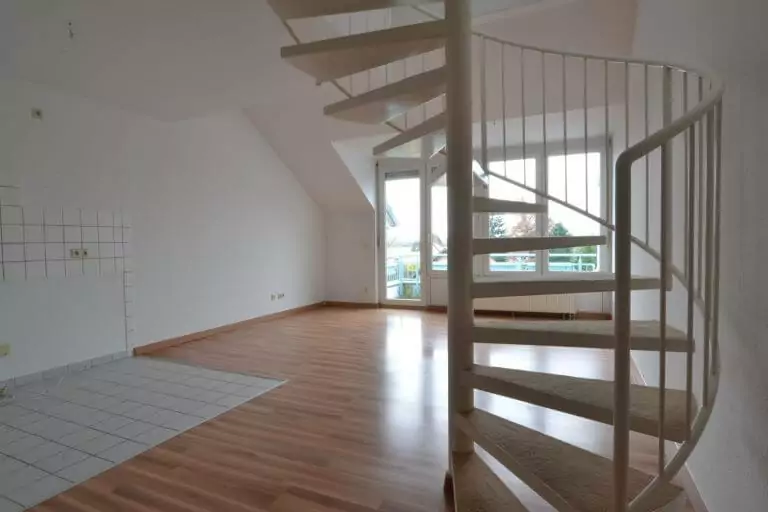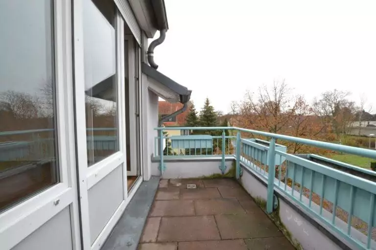 Die sehr gut geschnittene 3-RW- Maisonette-Wohnung befindet sich im 2. Obergeschoss und erstreckt sich auf zwei Wohnebenen. Die erste Wohnebene beinhaltet das helle und geräumige Wohnzimmer mit dem offenen Küchenbereich, einem Essplatz, das Kinderzimmer und das Duschbad. Vom Wohnzimmer aus gelangen Sie auf den großen Balkon mit Süd-Ausrichtung. Auf der oberen Ebene befindet sich das große Schlafzimmer, das Tageslichtbad mit Fenster und ein Abstellraum.
